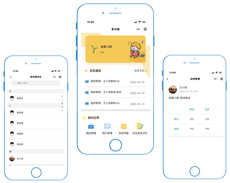 實(shí)現(xiàn)數(shù)字化辦公,對(duì)外向?qū)W生家長(zhǎng)提供各種服務(wù),如:消息通知、請(qǐng)假管理,校園活動(dòng),學(xué)生動(dòng)態(tài),教師通訊錄,學(xué)生定位等各種服務(wù)。對(duì)內(nèi)向教師提供各類(lèi)服務(wù),如:班級(jí)管理,考勤管理,請(qǐng)假管理,活動(dòng)管理,課堂點(diǎn)名,家長(zhǎng)會(huì)管理,教師課程等等各種服務(wù)